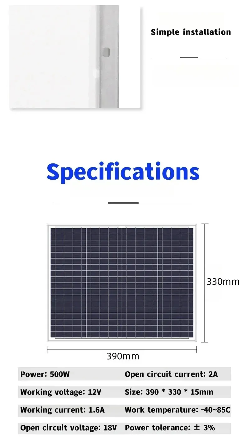 5.The solar panel must be installed in an area with good sunlight and no shadow. The long-term work of the solar cell module in the sun with shadow may have the risk of burning.