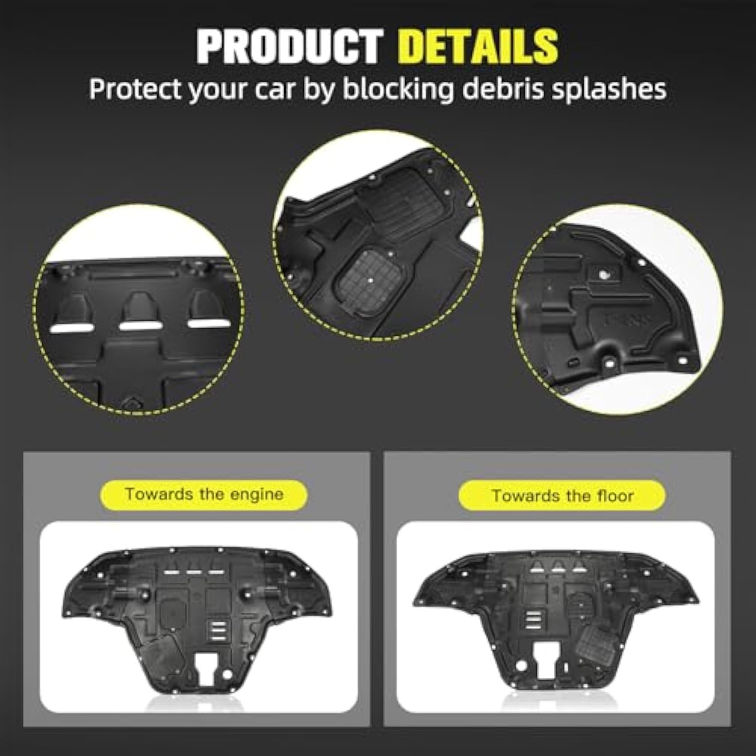 • 【Feature】The Engine Splash Shield Guard can help muffle the sound coming from the engine,reduce the overall noise from your vehicle.This will result in a more comfortable and pleasant driving experience