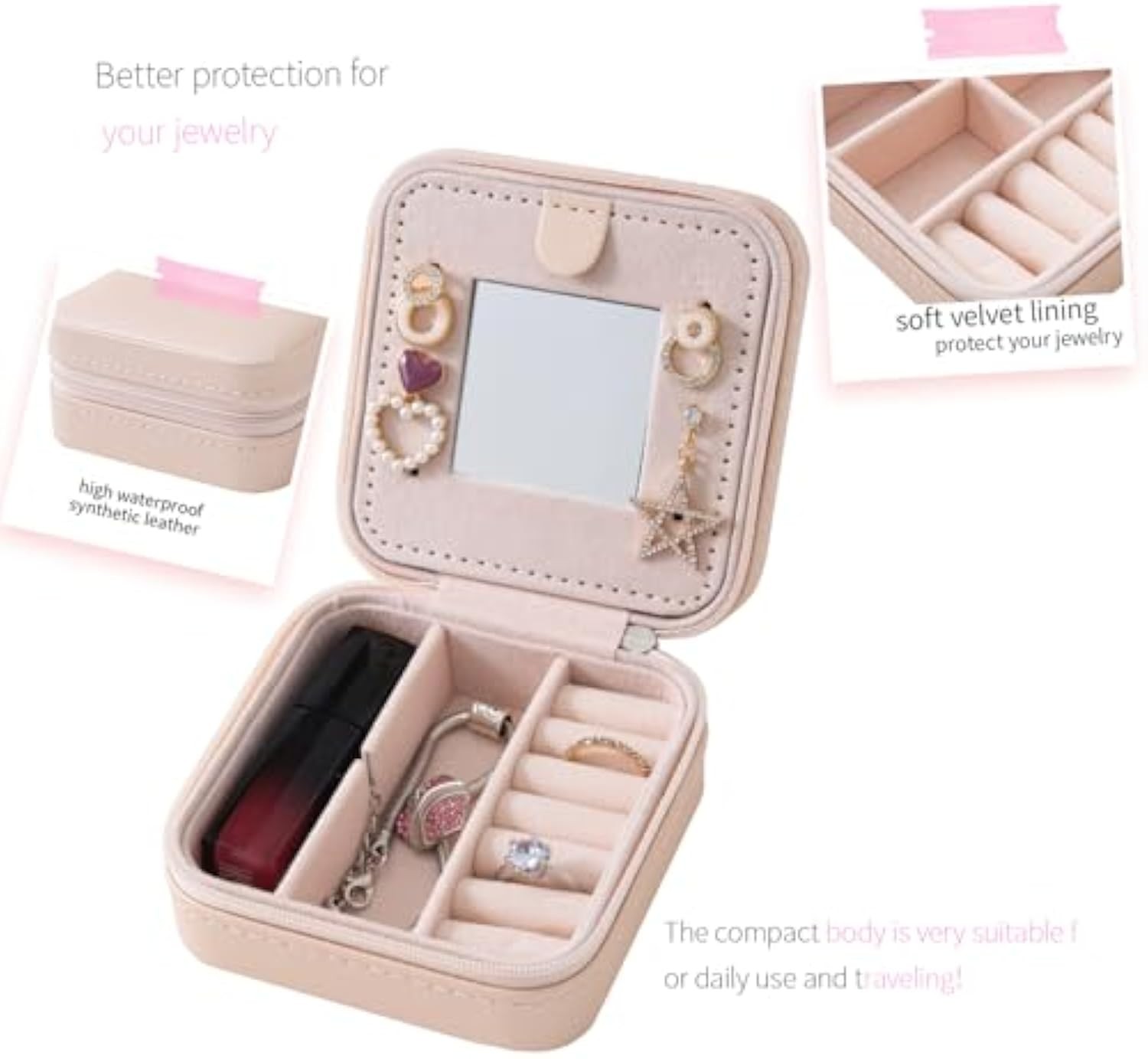 | Included Components | 6 ring rolls, 3 necklace hooks,1 mini vanity mirror , 4 divided compartments |