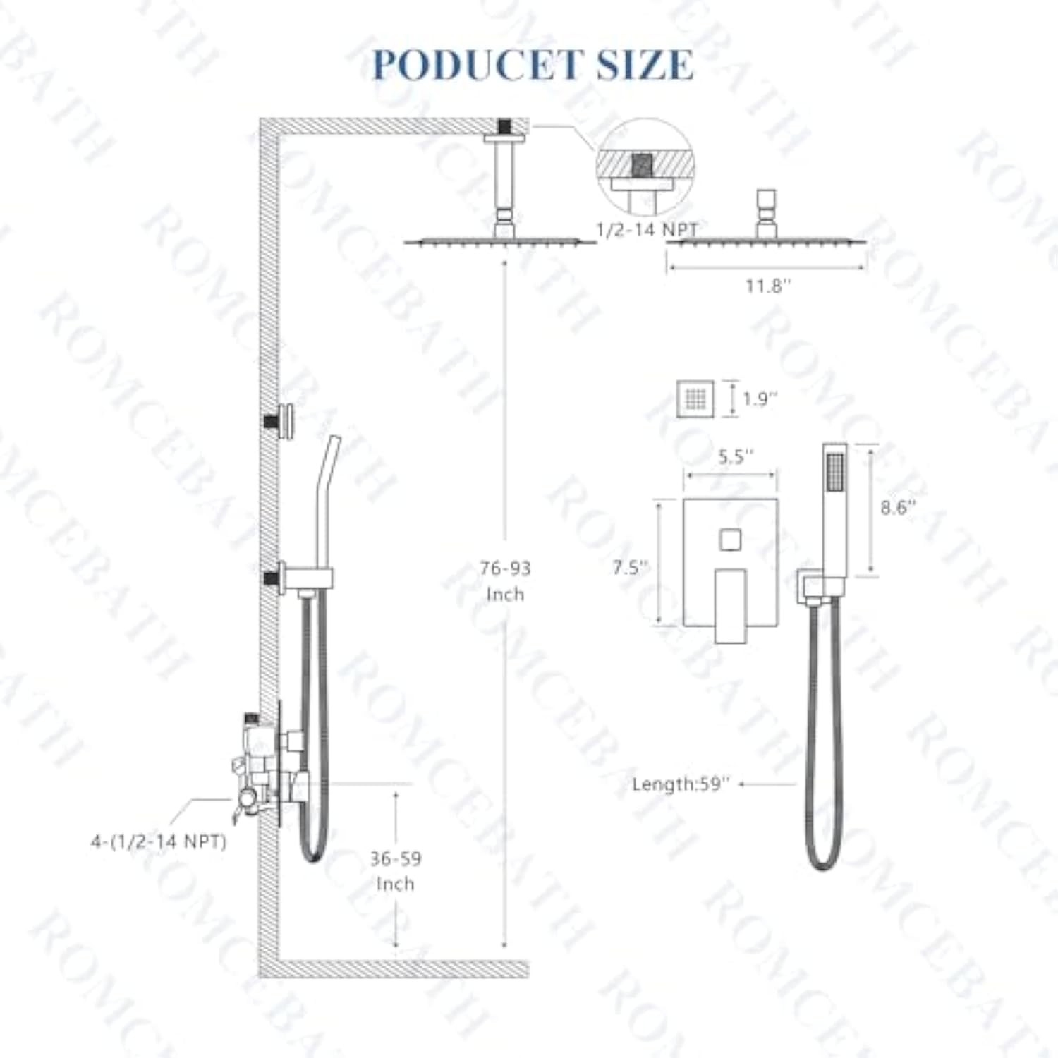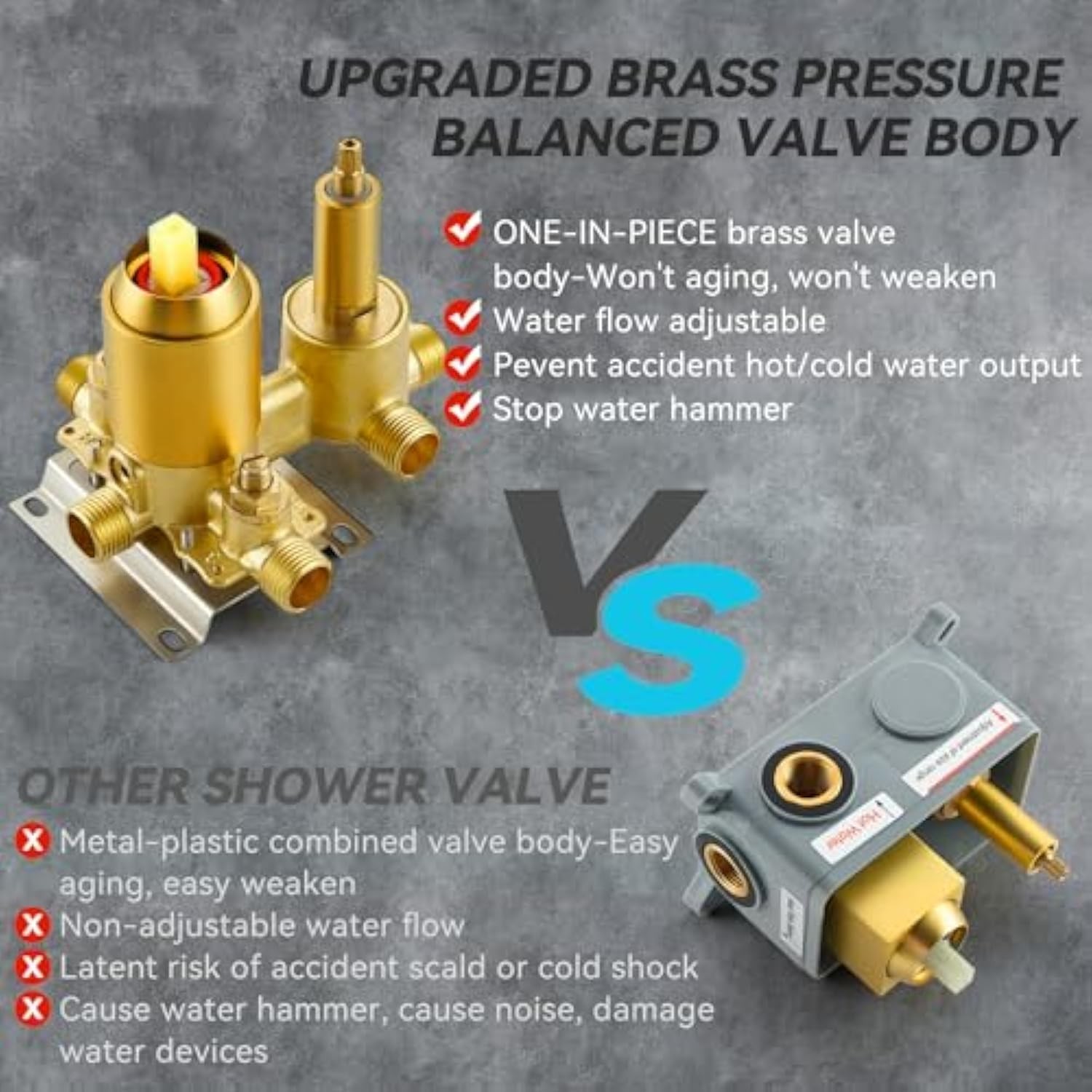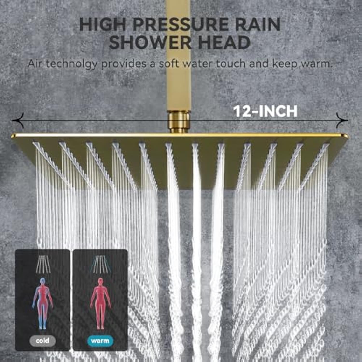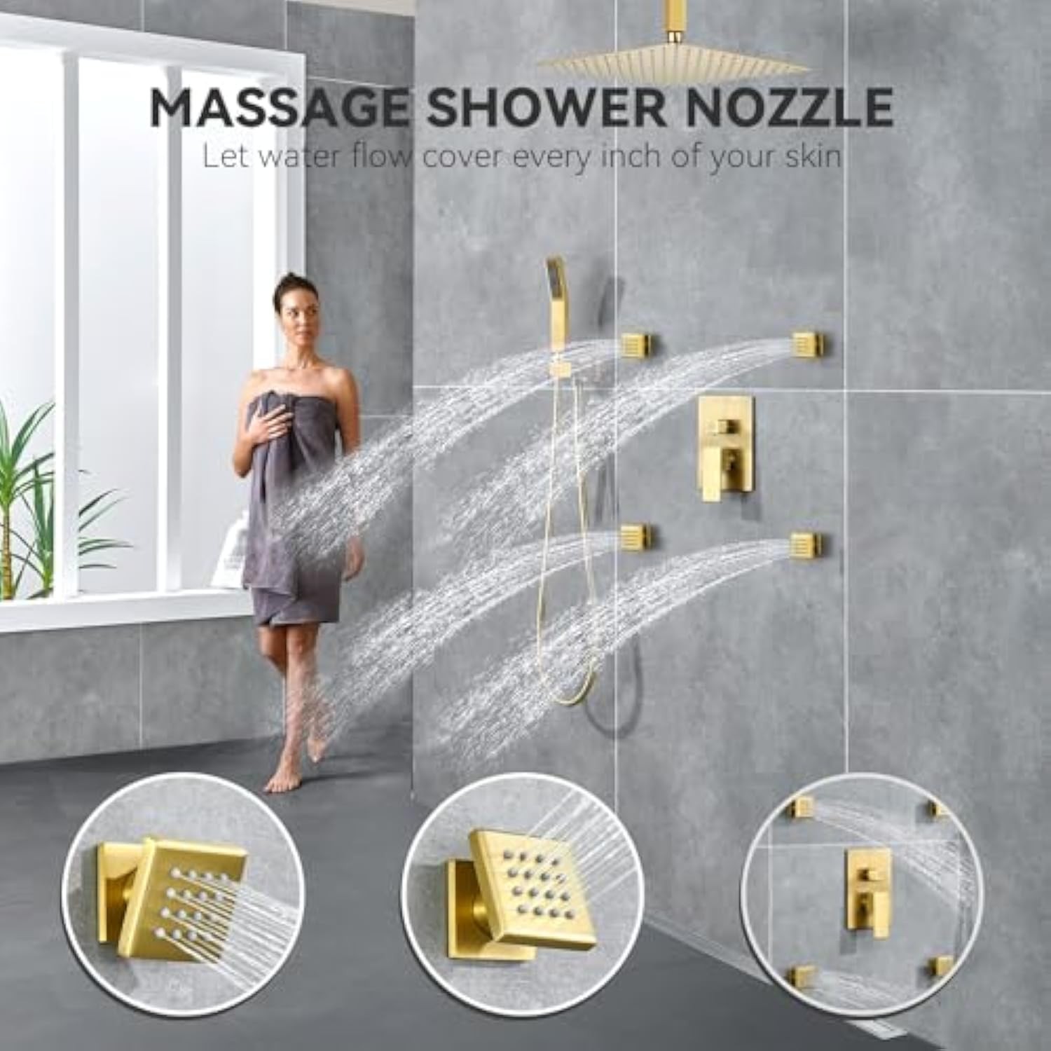 Rain Shower System With Complete 4 Pcs Body Sprays Jets And Pressured Balance Rough-in Valve,12Inch Rainfall Shower Head And Handheld, Modern Brushed Gold Ceiling Mount Shower Faucet Sets