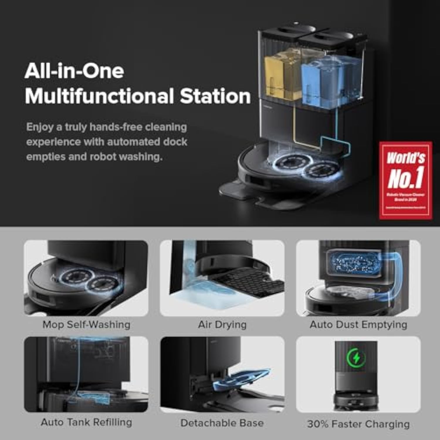 roborock Qrevo Series Robot Vacuum and Mop, 8000Pa Suction, Upgraded from Qrevo S, Anti-Tangle Brushes, Smart Obstacle Avoidance, Auto Mop Washing, All-in-One Dock, 200RPM Spinning Mops, Black(QV 35A)