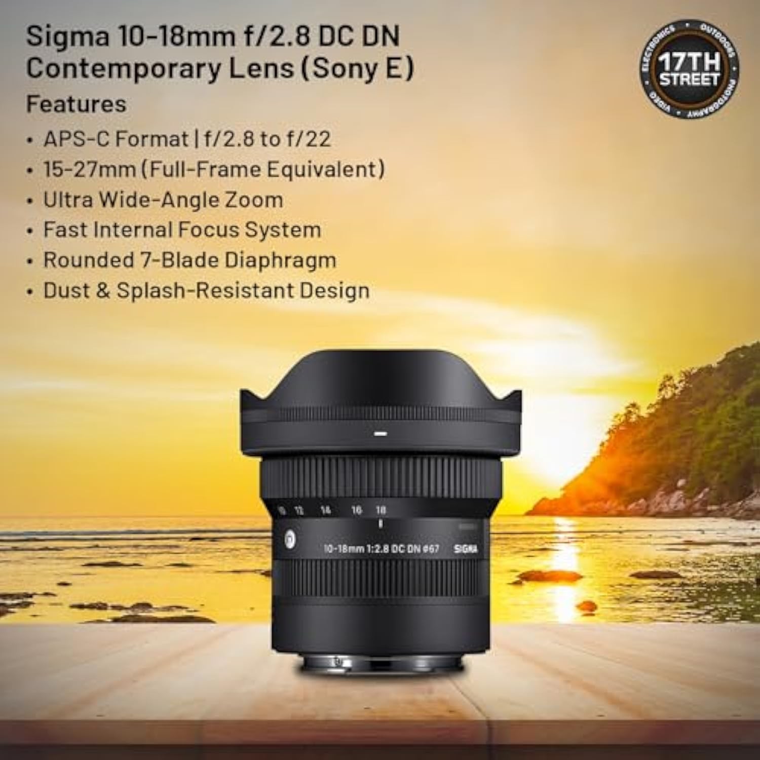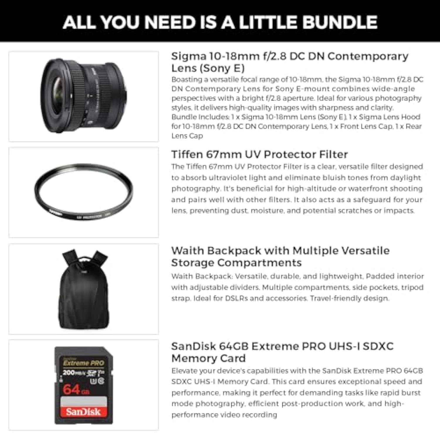 Sigma 10-18mm F2.8 DC DN Contemporary Lens for Sony E | Ultra-wide Zoom, includes a Tiffen 67mm UV protection filter, Waith camera bag, and a 64GB Extreme PRO UHS-I SDXC memory card (kit).