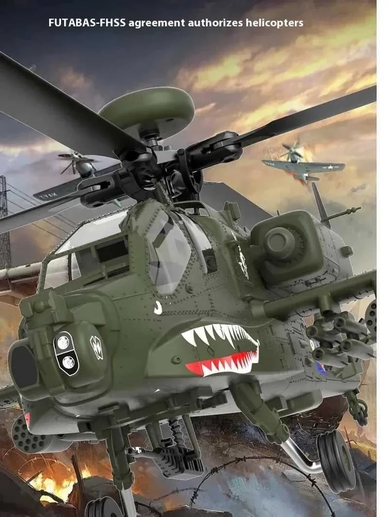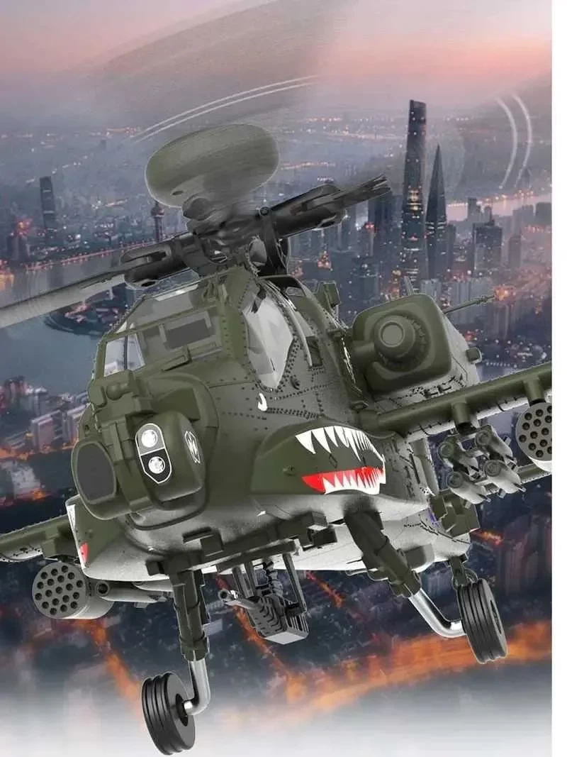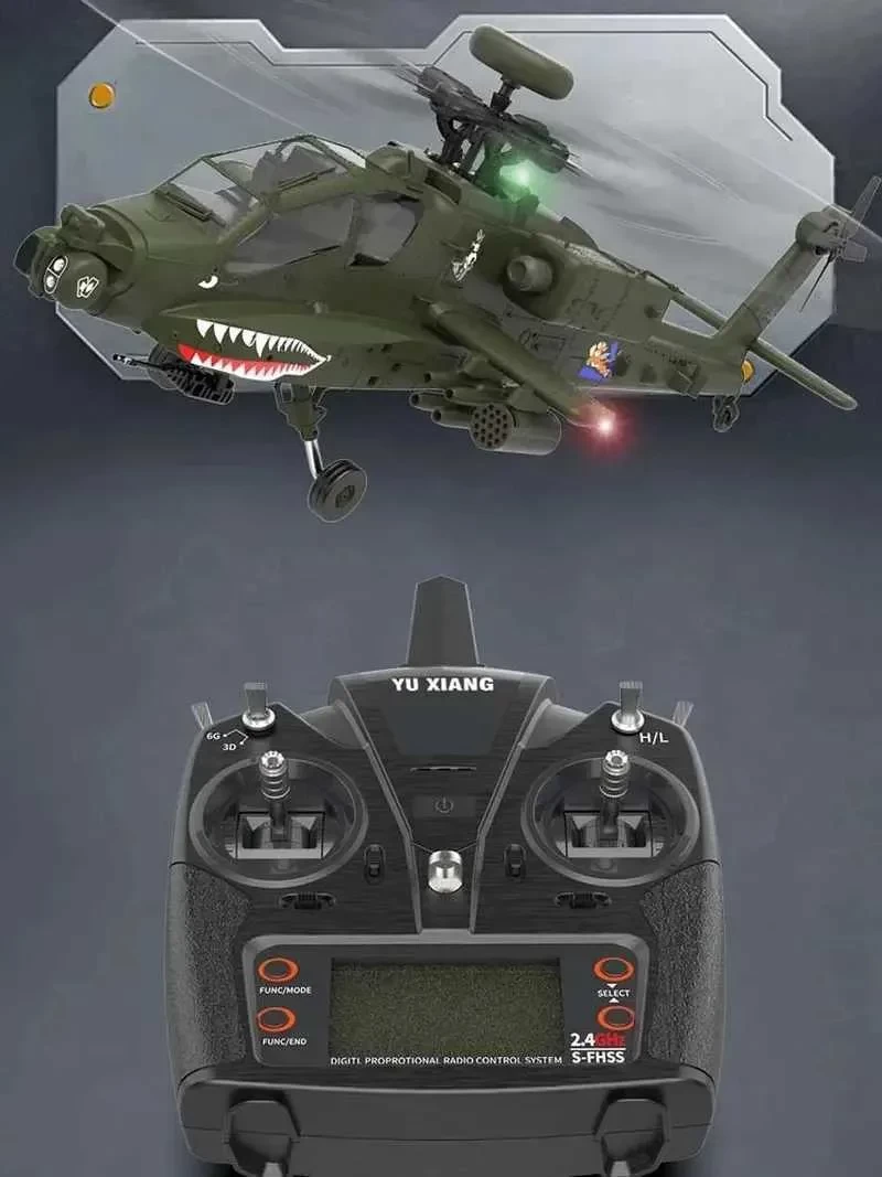 8 major features of the all-new YuxiangF11 Apache armed helicopterNo aileron design/high simulation/six axis gyroscope/intelligent battery/3D violent flight/easy maintenance/direct drive brushless motor 2.4GHZ remote control
